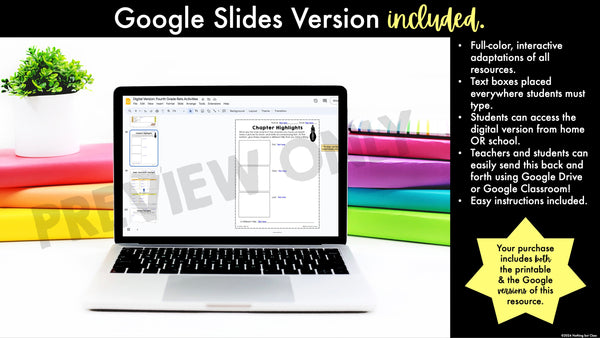 Digital Version Info: For the digital version(s), you will need Internet access and a free Google account, OR Google Classroom. Digital versions will work on computers or iPads. (To use Google Slides versions on an iPad without Google Classroom, simply have your students download the Google Slides app, available for free on iTunes.) Within your downloaded zip file, you will see explicit, easy-to-follow instructions that will get you started in minutes! Students will be highly engaged and freshly invigorated as they type, draw, and diagram directly into the file on their computers or tablets. They can easily share their work with you as they go, all without the hassle of paper, pencil, and copies. (Applies to paid products only.)
