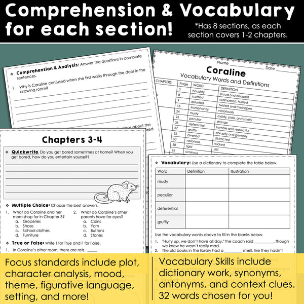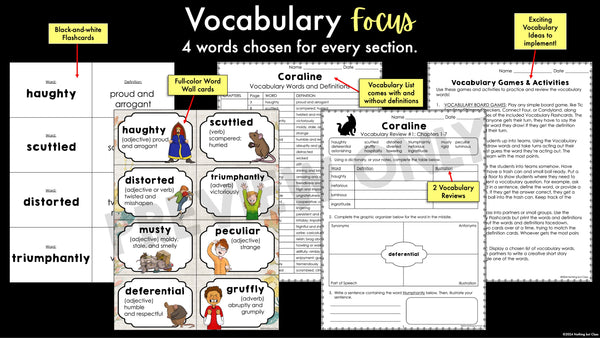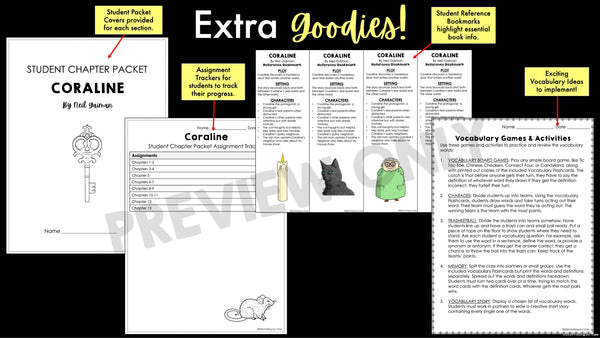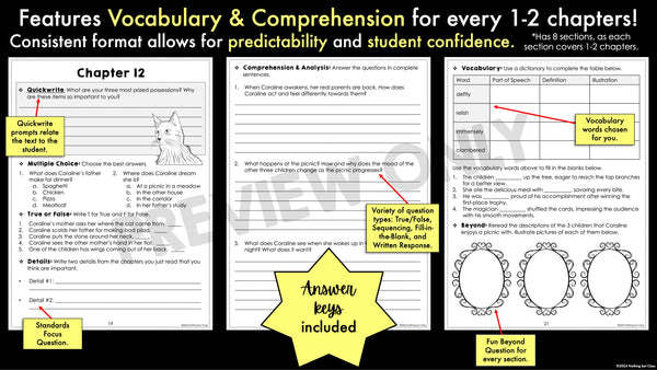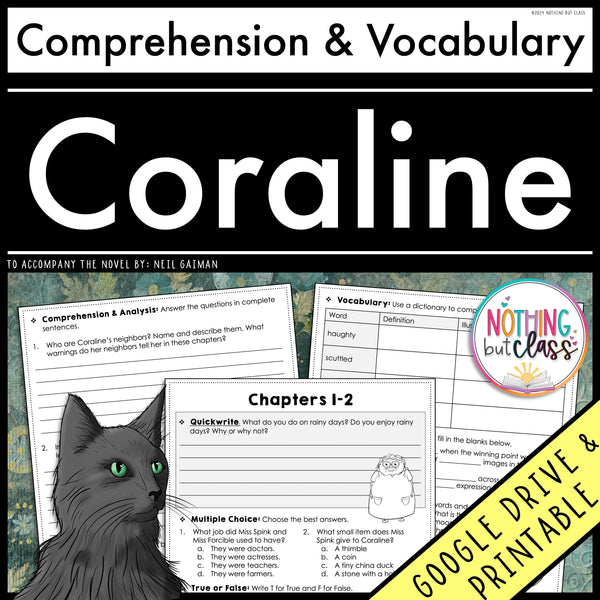Dive into the eerie world of Coraline, by Neil Gaiman, with this 75-page comprehension and vocabulary resource! Organized by every 1-2 chapters, this unit includes both printable and digital versions, perfect for any classroom setup.